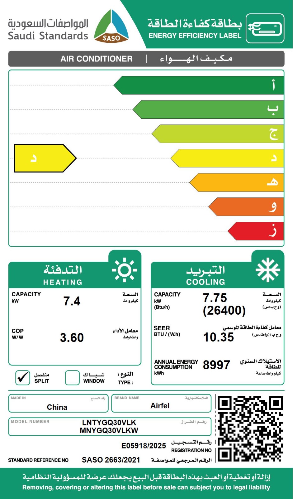 مكيف ايرفيل - سبيلت جداري - فريون - 410 عادي - واي فاي - 30 حار / بارد - LNTYGQ30VLK - MNYGQ30VLKW