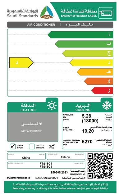 مكيف شباك فالكون سعة التبريد 18000 وحدة FTSR18C4