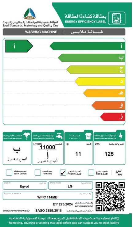 غسالة ال جي امامية 11 كيلو تنشيف 75 % اسود WFR1114MB
