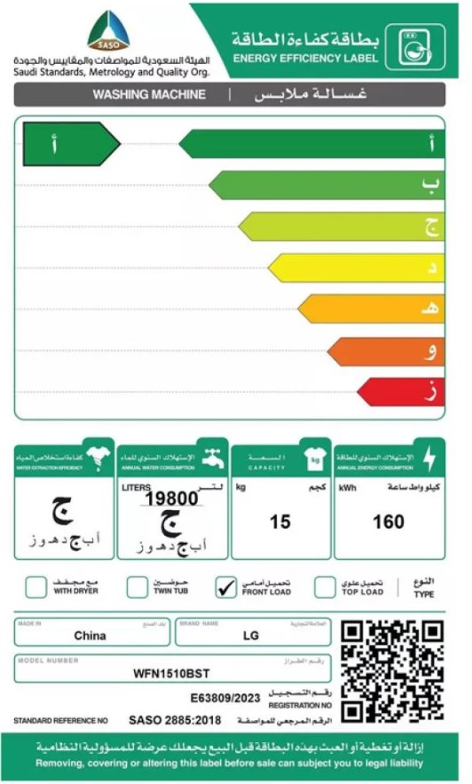 غسالة ال جي امامية 15 كيلو تنشيف 75% - WFN1510BST