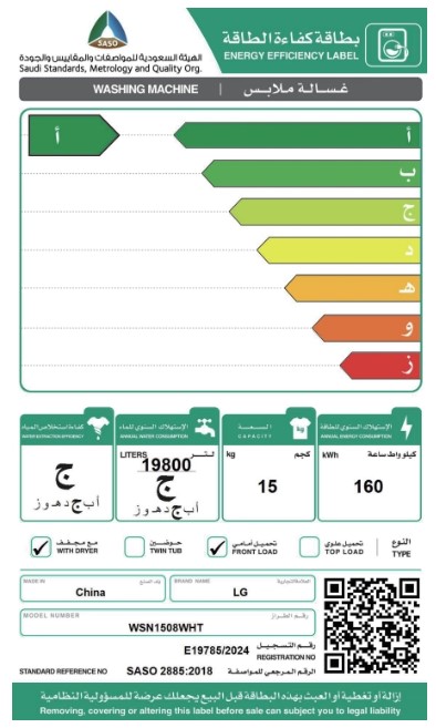 غساله LG فتحه اماميه 15 كيلو ابيض مع مجفف WSN1508WHT
