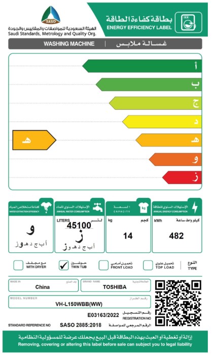 غسالة حوضين توشيبا 14 كيلو VH-L150WBB(WW)